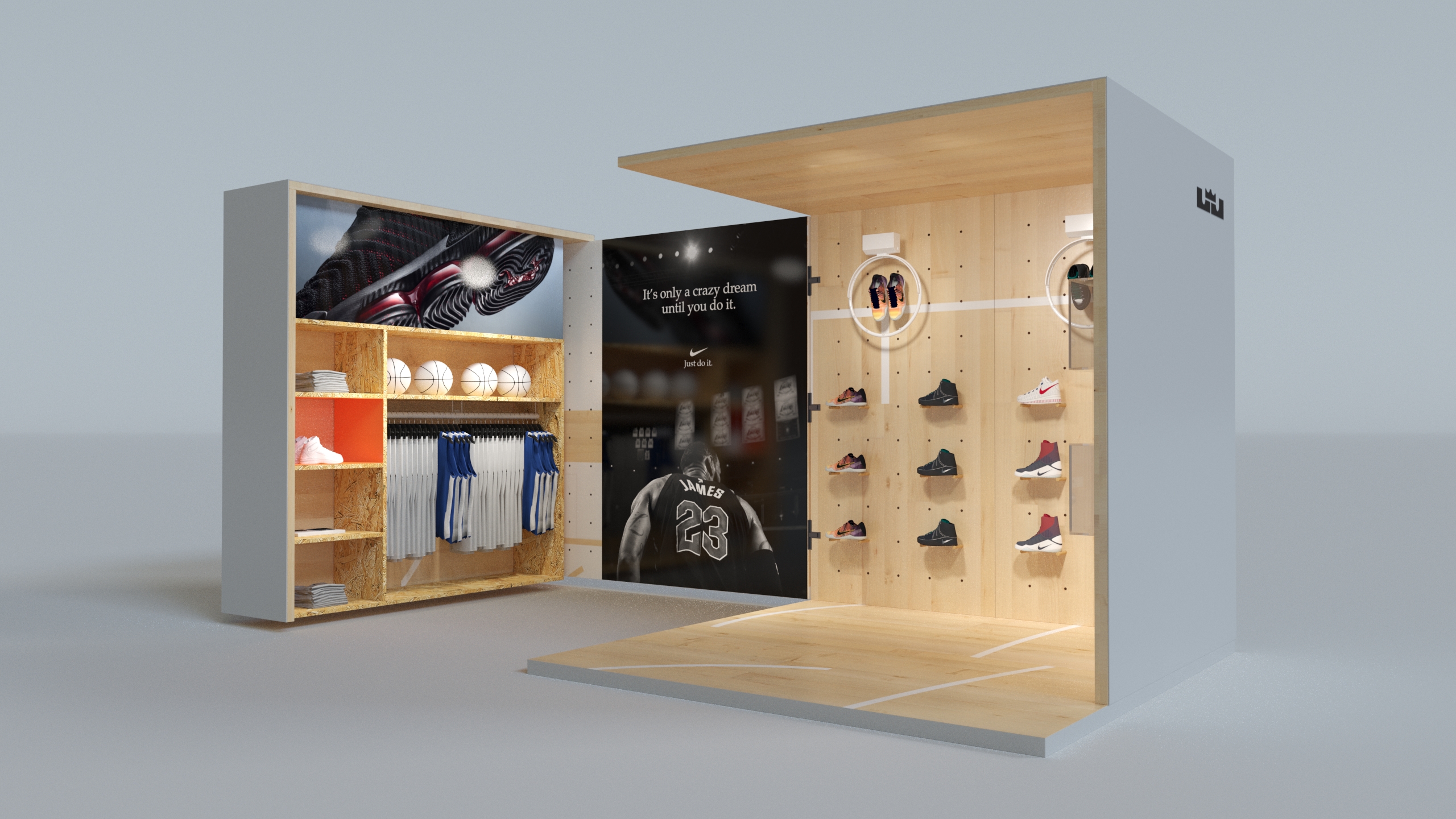 Nike HOH is a portable pop-up market in collaboration with Nike and Footlocker. The series of kiosks traveled to key events and games during the 2018/2019 NBA season. Each kiosk packs into an 8' x 8’ cube and unfolds into a unique market stand housing a different program. The kiosks range from small scale retail spaces and apparel customization stations to displays of player bios as well as Nike's influence on the game of basketball. The design was intended to occupy open plazas creating a large impact while having the small scale mobility of a transport truck.