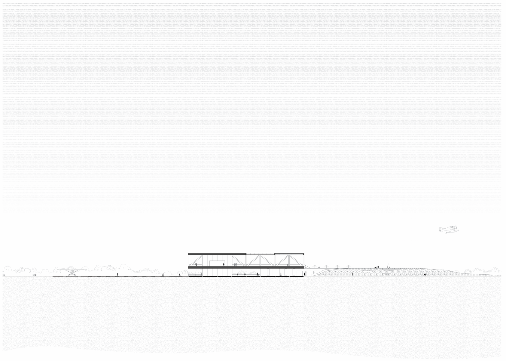 This comprehensive studio project proposes a new multi-program complex terminal for Harbour Air seaplane company. Located on Sea Island at the mouth of the Fraser River in Vancouver. This complex is intended to create a destination for both passengers and passers-by, the building houses a hotel, pool, restaurant, event space, retail and check-in as well as waiting rooms and maintenance space. These programs are united by a super-structure truss systems. The truss itself is lifted above an existing trail on the sea island dyke creating multiple covered outdoor spaces for watching seaplanes. On the ground floor, open circulation networks intersect as pedestrians are able to pass through the building and customers can either check into flights or hotel rooms.